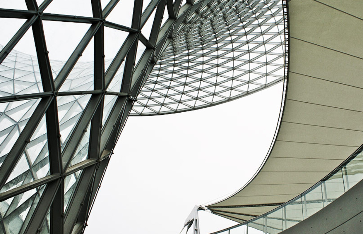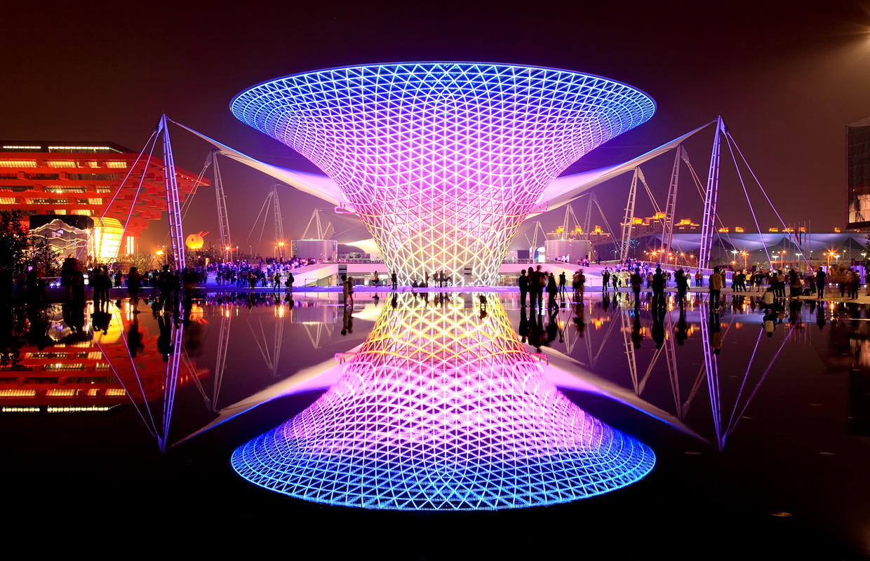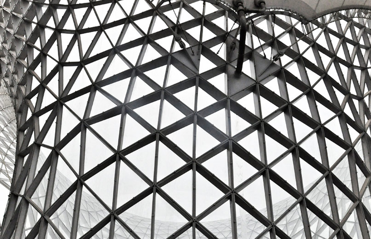 The EXPO Axis in Shanghai is one of the world's largest membrane roofs. As an employee at the Knippers Helbig office (before Programming Architecture was founded), Dr. Milos Dimcic had a task to generate an acceptable grid for the 6 funnel-like structures called Sun Valleys. Using structural relaxation techniques, a smooth and statically efficient triangular grid was generated over 6 free form surfaces, resulting in ~30.000 (5.000 x 6) unique structural members and 10.500 (1740 x 6) different structural joints.